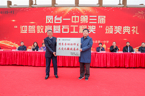 11月11日,凤台一中第三届“迎驾教育基石工程奖”颁奖典礼在西校区举行。凤台县县委书记熊寿宏,县人大常委会主任苏国宇,县政协主席马士平,市教体局党委书记、局长杨慎红,县委副书记叶宜声,副县长廖欣,迎驾贡酒股份有限公司董事长倪永培,迎驾慈善基金会理事长程培华等出席典礼,并为获奖师生颁奖。