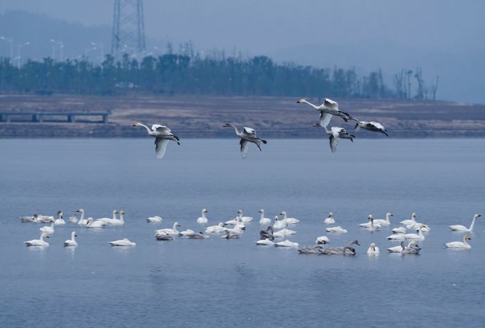 每到冬天,候鸟南迁。连日来,一大批大天鹅、白鹤等珍稀鸟类,陆续飞临霍山东淠河水域栖息,数量达上千只。珍禽们在此处觅食、高歌、飞舞,成为一道靓丽的风景,引来许多爱鸟人士和摄影者观鸟拍摄。