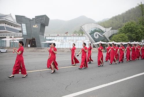 活动当天,身着旗袍的佳丽们手执油纸伞,两人一排呈等距离纵队,伴随着舒缓的音乐声,从迎驾山庄出发,跨过迎驾大桥,经过迎驾酒文化博物馆,缓缓步入迎驾集团。在水光山色映照下,佳丽们宛如流动的色彩、是蜿蜒的诗行,与道路旁绽放的杜鹃花齐美共芳,成为醉美酒厂的又一道靓丽的风景线。