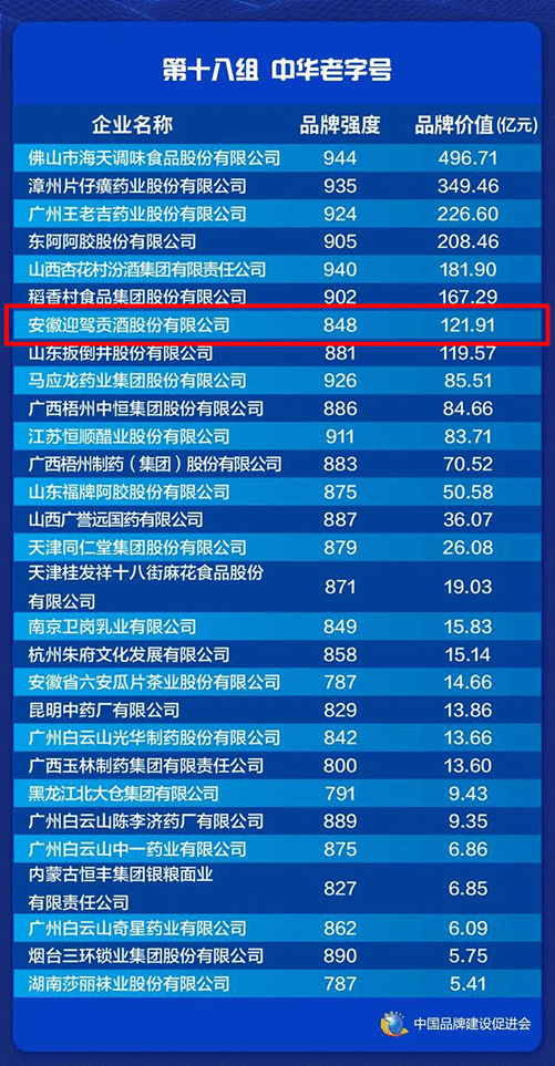 5月9日,值我国第五个中国品牌日之际,新华社、中国品牌建设促进会、中国资产评估会、国务院国资委新闻中心等单位联合发布了2021中国品牌价值评价信息,迎驾贡酒以848的品牌强度和121.91亿元的品牌价值荣登区域品牌(地理标志)百强榜,位列中华老字号品牌类上榜企业第七名。