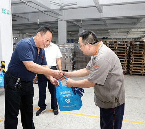 杨兴国首先来到彩印分公司生产车间,看望了奋战在生产一线的员工,向他们送上毛巾等防暑降温物品,在炎炎夏日为大家带来一股清凉。杨兴国叮嘱员工们在坚守岗位、做好工作的同时,要树牢安全意识、加强劳动保护,注意防暑降温和疫情防控。