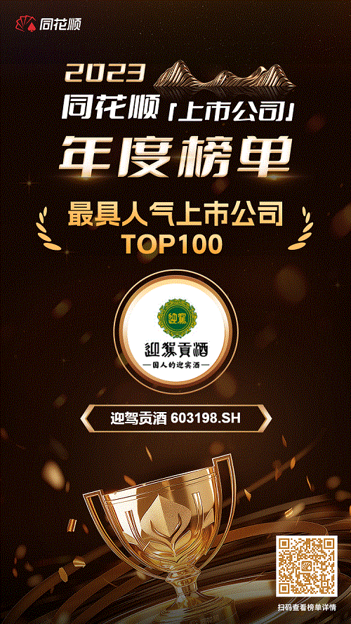 1月4日,2023同花顺上市公司年度榜单正式公布,迎驾贡酒荣获2023年度“最具人气上市公司TOP100”奖项,董事会秘书孙汪胜荣获2023年度“最受欢迎董秘TOP100”奖项。