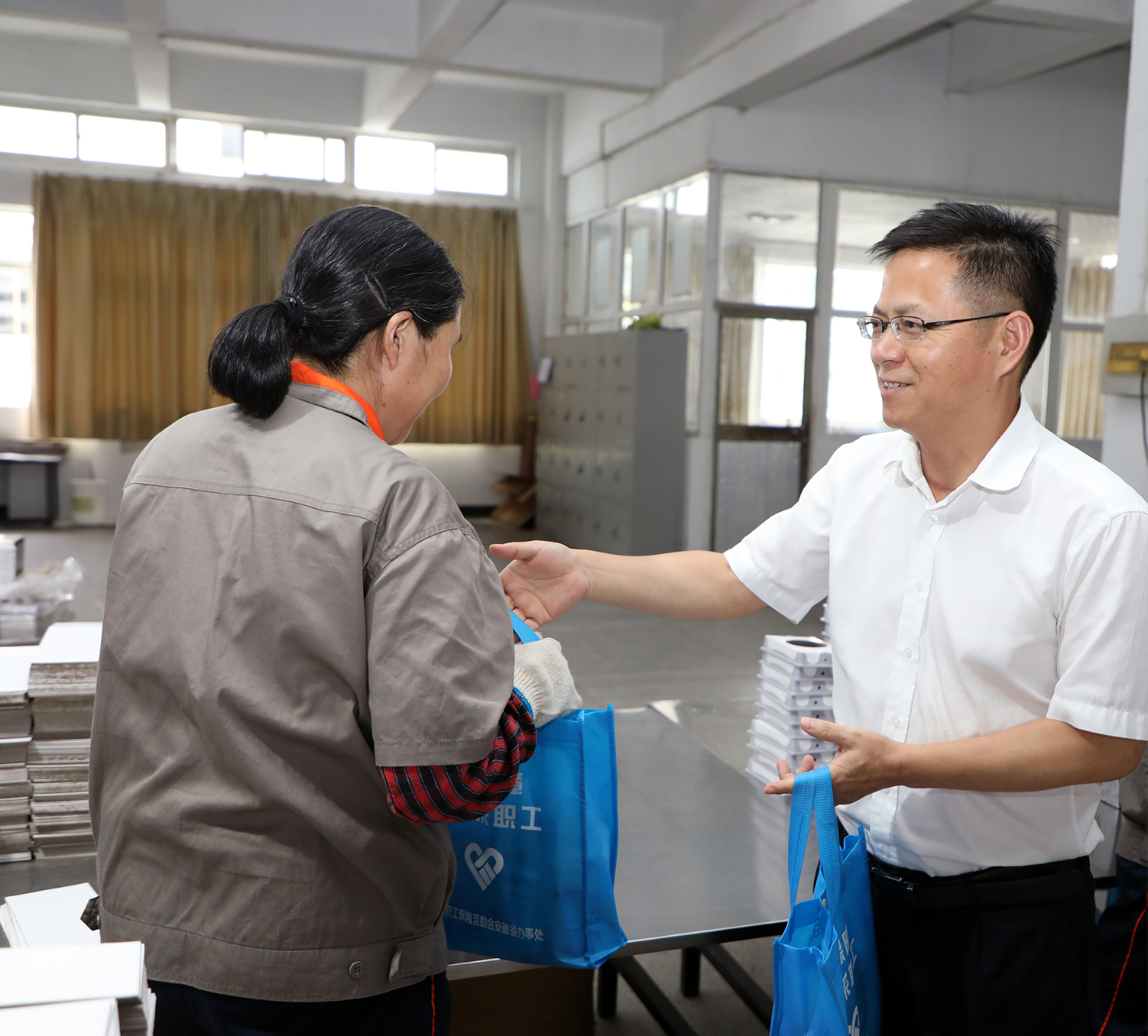 8月9日,中国职工保险互助会安徽办事处主任杨兴国来迎驾开展“互助保障送清凉”慰问活动,六安市总工会党组成员、副主席张仪,霍山县总工会党组书记、常务副主席杨继祥,迎驾集团副总裁、工会主席程培华等陪同慰问。杨兴国首先来到彩印分公司生产车间,看望了奋战在生产一线的员工,向他们送上毛巾等防暑降温物品,在炎炎夏日为大家带来一股清凉。杨兴国叮嘱员工们在坚守岗位、做好工作