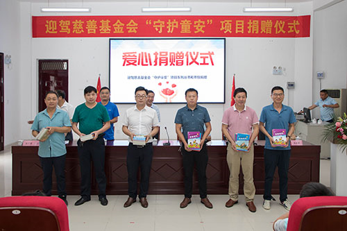 仪式上,迎驾慈善基金会向东西溪、大化坪、上土市等10所学校的师生代表捐赠了“素质教育——守护童安”系列图书和学生安全书包。