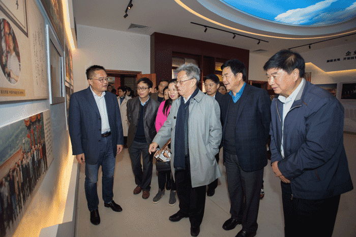 在企业文化展厅,王蒙久久驻足于第一届大别山生态文化笔会的合影前。2000年10月,迎驾举办了首届大别山生态文化笔会,王蒙、鲁彦周、邓友梅、张贤亮、邵燕祥、叶兆言、储福金等20多位当代一流作家齐聚迎驾,就迎驾文化建设,乃至大别山地区文化发展建言献策,对当代文坛影响深远。王蒙作为第一届迎驾笔会的参与者之一,在当时就与迎驾结下了不解之缘,迎驾酒文化博物馆的馆名正是由王蒙亲笔题写。