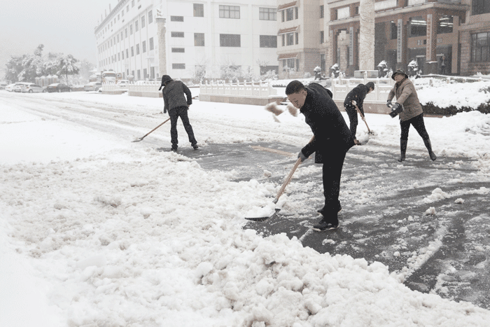 降雪发生后,1月4日一大早,集团立即组织广大干部职工参与到路面积雪清扫活动中,集团领导张平、程培华、秦海多次要求安全措施落实到位,并亲自上阵铲雪。在厂区主干道以及迎驾大桥路段,为确保通行安全,集团紧急调配铲车铲雪,并安排人员在路面撒盐融雪,确保下班前路面行车通畅。针对家住偏避偏远地区的员工,公司也提醒他们尽量就近住宿,以解决因冰雪天气带来的上下班出行不便问题,减少安全事故发生。