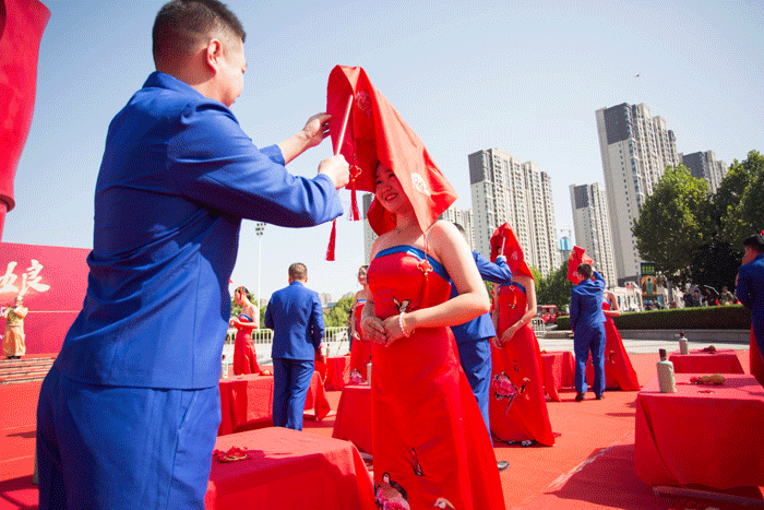 在传统婚俗表演结束后,集体婚礼正式拉开帷幕。活动现场,20对新人身着礼服,庄重地进入典礼现场。在婚礼执事的指引下,新人们依次进行迈火盆、三拜、掀盖头、行结发礼、饮合卺酒等环节,尽显传统婚礼仪式的庄重典雅。
