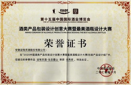 11月2日,由中国酒业协会主办的“第十五届中国国际酒业博览会”在泸州国际会展中心隆重举办。迎驾贡酒生态洞藏30产品荣获“2019年度‘青酌奖’酒类新品(白酒类)”称号;迎驾贡酒·生态霍山荣获“2020中国酒类产品包装设计创意大赛暨最美酒瓶设计大赛(包装产品设计组)”优秀奖。