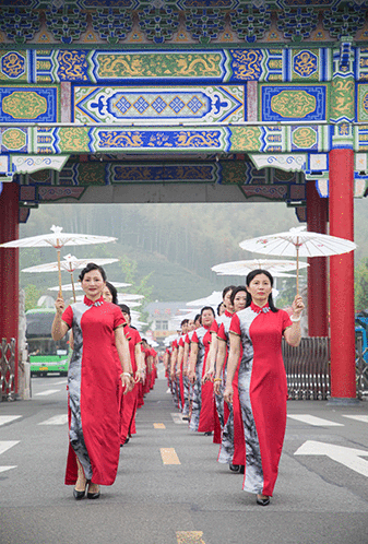 活动当天,身着旗袍的佳丽们手执油纸伞,两人一排呈等距离纵队,伴随着舒缓的音乐声,从迎驾山庄出发,跨过迎驾大桥,经过迎驾酒文化博物馆,缓缓步入迎驾集团。在水光山色映照下,佳丽们宛如流动的色彩、是蜿蜒的诗行,与道路旁绽放的杜鹃花齐美共芳,成为醉美酒厂的又一道靓丽的风景线。