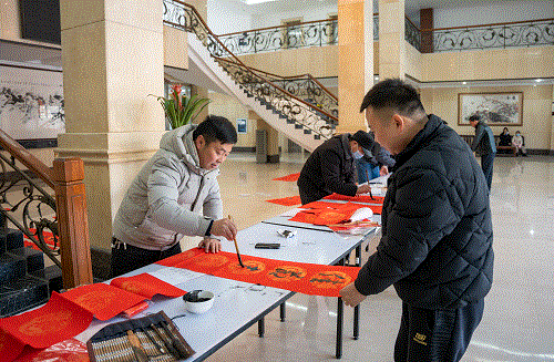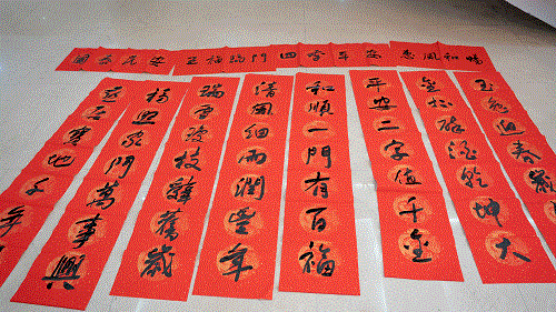 活动现场气氛热烈、翰墨飘香、人头攒动,来自县书法家协会的五名书法家现场泼墨挥毫,将一副副承载着新春祝福和对幸福生活美好愿景的春联、一个个喜气四溢的福字送到员工手中,温暖了每一颗心灵。不一会功夫,现场就摆满了各式各样的对联和福字,红彤彤的一片显得格外喜庆,年味十足。